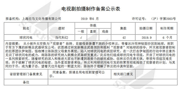 新京報訊 (記者)根據國家廣電總局公布的電視劇6月備案公示顯示,劉慈欣的科幻小說《球狀閃電》將被改編為電視劇,報備機構為上海應馬文化,該劇共計42集,預計將于2019年9月開拍,制作周期約6個月。這是繼5月《三體》已備案后,劉慈欣又一部作品將改編為電視劇。