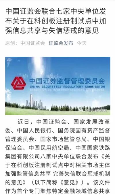 《關于在上海證券交易所設立科創板并試點注冊制的實施意見》第十九條也顯示,將發行人和相關中介機構及責任人的信用記錄納入國家統一信用信息平臺,加強監管信息共享,完善失信聯合懲戒機制。