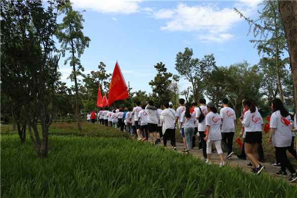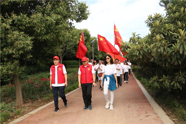 “竹深樹密蟲鳴處,時有微涼不是風”。長約10公里的中原路沿路綠色生態環廊被絲絲細雨洗刷一新。鄭州市政務服務中心及鄭州銀行共8個黨支部300余人的隊伍在黨旗國旗的引領下浩浩蕩蕩地沿著環廊行進,大家的臉上洋溢著喜悅,心中充滿了堅定。作為一名黨員,為人民服務的宗旨和使命就是追隨著一代代共產黨員的腳步踏踏實實走出來的。