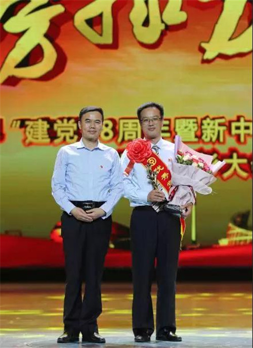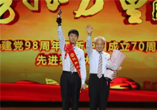 第一屆“榜樣力量”敬業奉獻模范,漯河分行退休員工黃進選為其子黃旭峰頒獎
