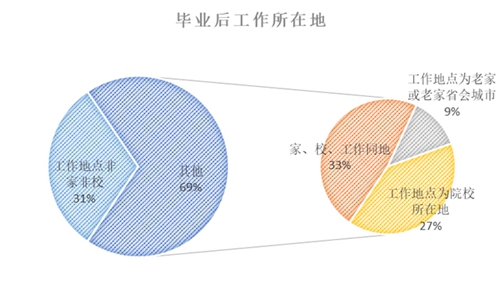 數據顯示,近七成畢業生選擇留在老家或學校所在地工作,而其中家、校、工作同地的占比近半??傮w而言,選擇繼續留在學校所在地就業的學生仍然占大多數。其中,北京、上海、天津、武漢、西安、南京、廣州、杭州、成都等經濟發達的城市,擁有眾多高校在吸引就業方面成為贏家。