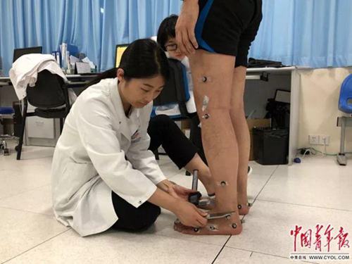 ↑醫生正在給患者測量腳踝寬度,為三維步態測試提供參考數據。劉昶榮攝