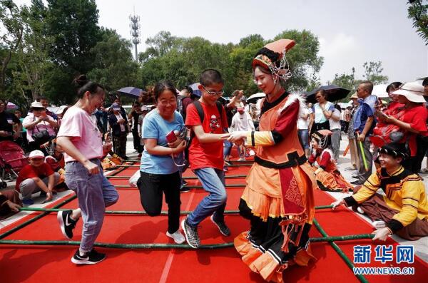 7月18日,游客在北京世園會廣西園前體驗竹竿舞。新華社記者鞠煥宗攝