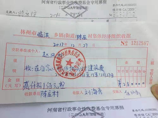趙風林所持有《土地確權證書》顯示,村民趙風林的自建房屬于非基本農田性質,未辦理土地、規劃等手續,臨淇鎮陳莊村村委會2009年起向死者每年以房基地、城鄉規劃、城鎮建設捐款、鄉村建設規劃、臨時建筑費等名義收取1500元至4500元不等的費用。
