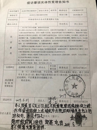 記者在林州一份信訪受理告知書材料看到,死者兒子反映的訴求主要為,村干部在未公示或出示國土資源局征地公告、沒有任何手續的情況下,2019年4月份起,以新農村規劃為由,對陳莊村土地予以征收,征地手續是否合法;村委會自2009年至2017年,以各項名義,對違法建筑收取2700元至4500元不等的費用,收費是否合法,存在不存在違規收費等行為,村干部在執行這項拆遷工作中,是否一視同仁,有沒有選擇性的執法,死者兒子趙軍委認為,其父之所以會選擇用自殺的方式來解決此事,主要是因為連年來,村干部以此事之名,巧立名目,經常向其收取高達上千元的費用,無力承擔,在拆遷過程中,沒有一視同仁,選擇性的執法,正是這樣,給死者心里造成極大的壓力,超出了死者的心里承受能力,所以,才會用極端的方式,來維護自己的合法權益。