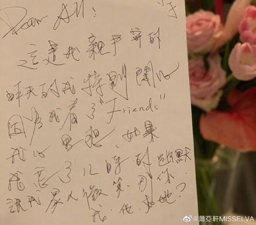 7月18日凌晨,蕭亞軒在社交平臺發布一段視頻,視頻中她似乎神志不清,團隊發文回應是因為她的狗生病她很擔心。同一天晚間,蕭亞軒通過微博發文,寫道:“寫了幾句話,吃一頓辣辣的晚餐??!”疑似為自己凌晨的事件作出回應,證實沒有網友口中的憂郁,并配上手寫信,信中她寫道“Dear All,這是我親手寫的,昨天的我特別開心,因為我看了‘Friends’,我心里想,如果我忘記了兒時的幽默,讓我家人微笑,那你,我,他和她?”