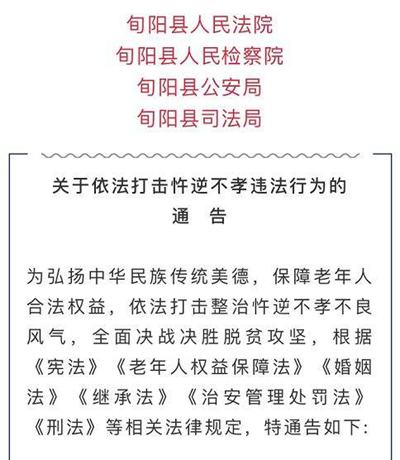 這份由旬陽縣人民法院、檢察院、公安局、司法局聯合發布的《通告》中提到了6種“忤逆不孝”情形,具體包括,子女居住在新房樓房中,任其老人居住在舊房危房中有關情形的;隱瞞家庭實際狀況,與老人分戶另過,對老人生活不管不顧,意圖套取或已經套取國家惠民政策或扶貧政策等情形的;霸占老人“一折通”,將政府發放的補助金、養老金據為己有,或攫取老年人務農務工收入,致使老人日常生活十分困難等情形的;子女眾多但在贍養父母老人的義務上互相推諉、糾紛不斷,致使贍養責任落空,父母老人生活出現困難等情形的;鼓動煽動、教唆恐嚇驅使老人到縣鎮村索要扶貧惠農政策,并利用不正當手段要挾當地政府、幫扶干部等情形的;子女對父母老人進行歧視、侮辱、打罵、傷害甚至虐待、遺棄等嚴重失德違法情形的。