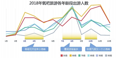 攜程數據顯示,氧吧游客中,60后游客占比最高,達20%;50后和60后游客占比總計達到了39%。此外,氧吧旅游峰值期會出現在暑期7月~8月。而在3月、4月春暖花開,以及9月、10月秋高氣爽時,則是另外兩個游客小高峰。