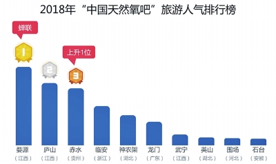 根據跟團游和自由行數據顯示,江西婺源、江西廬山、貴州赤水、浙江臨安、湖北神農架、廣東龍門、江西武寧、湖北英山、河北圍場和安徽石臺成為人氣排名前十的氧吧目的地。
