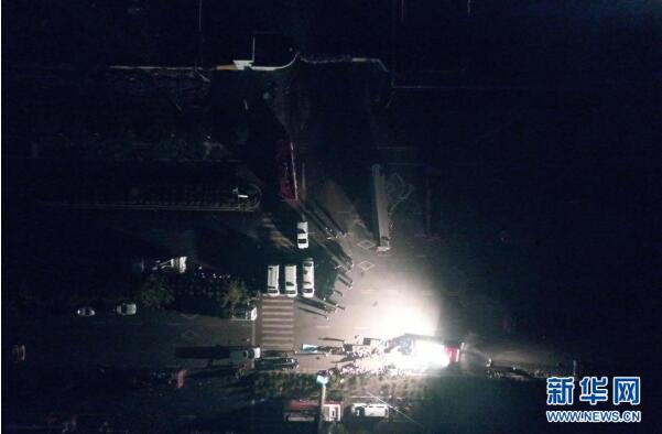 7月20日凌晨,救援人員在爆炸現場守候(無人機拍攝)。新華社記者馮大鵬攝