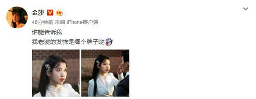 7月19日,金莎在微博曬出兩張韓國女歌手IU的劇照,并附文:“誰能告訴我,我老婆的發飾是哪個牌子噠?”