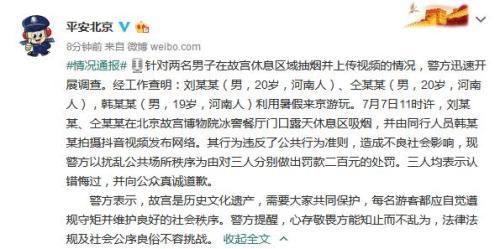 通報稱,經工作查明:劉某某(男,20歲,河南人)、仝某某(男,20歲,河南人),韓某某(男,19歲,河南人)利用暑假來京游玩。7月7日11時許,劉某某、仝某某在北京故宮博物院冰窖餐廳門口露天休息區吸煙,并由同行人員韓某某拍攝抖音視頻發布網絡。其行為違反了公共行為準則,造成不良社會影響,現警方以擾亂公共場所秩序為由對三人分別做出罰款二百元的處罰。三人均表示認錯悔過,并向公眾真誠道歉。