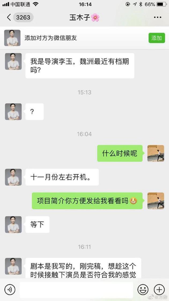 7月21日,許魏洲經紀人通過微博曝光近日遭遇騙子冒充導演李玉的信息,并透露李玉近日沒有新片拍攝,稱騙子太弱智。從曝光的信息截圖看出,對方自稱新戲將在十一月份開機,現在只是想接觸一下演員是否符合對方的要求。稍后,李玉導演轉發此微博稱這種騙人伎倆既蠢又笨,并感謝許魏洲經紀人。