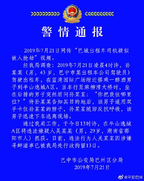 針對7月21日網傳的“巴城出租車司機疑似被人搶劫”視頻,四川省巴中市公安局巴州區分局當晚在其官方微博發布警情通報稱,目前,違法行為人吳某某因涉嫌尋釁滋事已被巴中市公安局巴州區分局處行政拘留13日。