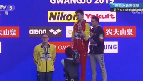 然而在最后登上領獎臺時,令人不愉快的一幕出現了。比賽中不敵孫楊最終獲得第二的霍頓全程拒絕登上領獎臺,此外他還拒絕與孫楊以及銅牌獲得者意大利選手德蒂合影。