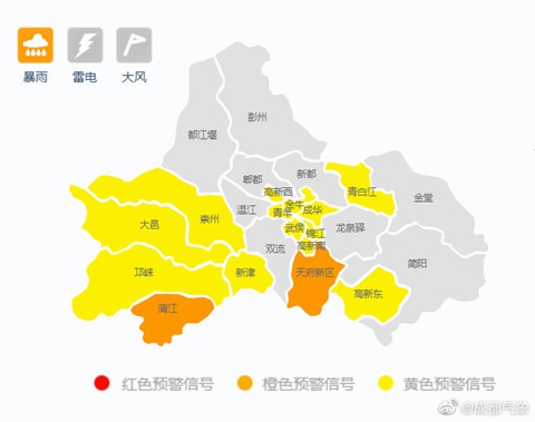 【成都發布暴雨預警】記者獲悉,成都市氣象臺7月22日10時50分發布暴雨黃色預警信號:目前成都市金牛區、青羊區、武侯區、錦江區、成華區、高新西區、高新南區、高新東區和青白江區有較強對流云系開始發展,預計未來6小時,上述地區的部分地方累計雨量可達暴雨,降雨時伴有雷電和短時陣性大風,請注意防范。