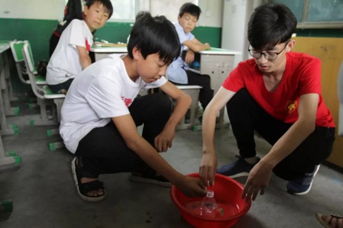 在接下來的一周支教過程中實踐隊員緊緊圍繞“科普支教”的主題,并結合自己的專業特色,精心準備了多樣的物理實驗課。在“有趣的紙飛機”實驗課上,實驗老師為小朋友們介紹了四種有趣的紙飛機:"蘇珊"紙飛機、回旋紙飛機、沖浪紙飛機、圓筒紙飛機;在“無形的摩擦力”實驗課上,實踐隊員用分別裝滿沙子和裝滿水的瓶子在斜坡上下落時間不同的實驗,向同學們證明了分子之間存在摩擦力;“神奇的大氣”實驗課上,實踐隊員用簡單的實驗向孩子們證明了空氣的存在。