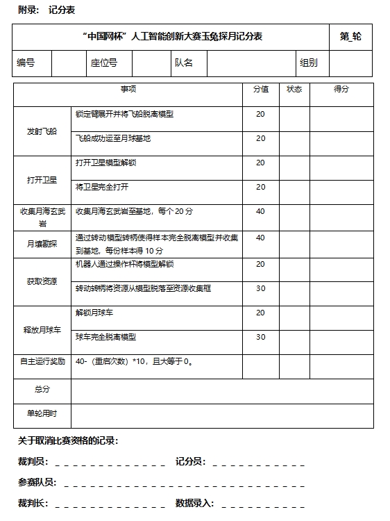 6.2.1.2 參賽隊的學生隊員經檢錄后方能進入調試區。裁判員有權對參賽隊攜帶的器材進行檢查,所用器材必須符合組委會相關規定與要求。參賽隊員可以攜帶已搭建的機器人進入調試區。隊員不得攜帶組委會明令禁止使用的通信器材進場。所有參賽學生在調試區就座后,裁判員把附加任務得分說明及任務位置告知各參賽隊。
