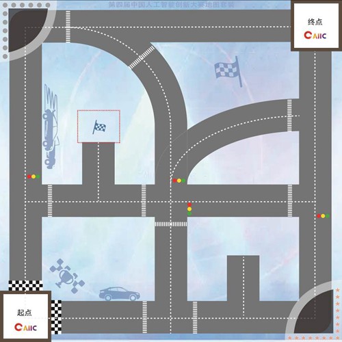 參考場地地圖尺寸為200*200cm,材質為PU布或噴繪布。道路寬度約20cm,場地有始發點和終點,終點為停車區;到達停車區,參賽隊員可提前宣布比賽結束。另有三個維修基地,當機器人進入維修基地后,可以任意改裝和維修機器人。