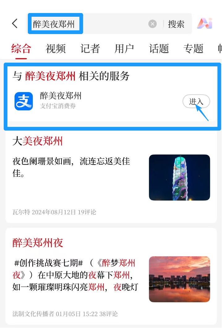 1、頂端新聞app內搜索“醉美夜鄭州”,點擊“進入”即可領券。