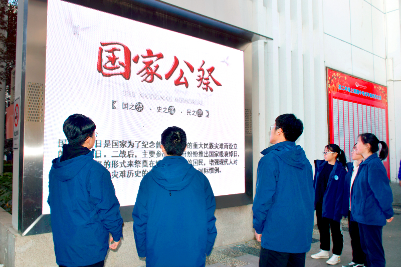 鄭州第四十七中學在教學樓的樓頭大屏幕上滾動播放南京大屠殺的記錄照片以及國家公祭日照片。通過觀看有關烈士紀念日和全國公祭日的視頻和圖片,學生深刻了解“國家公祭日”的內涵,激發了學生的愛國之情,傳遞“為實現中華民族偉大復興而不懈奮斗”的正能量。