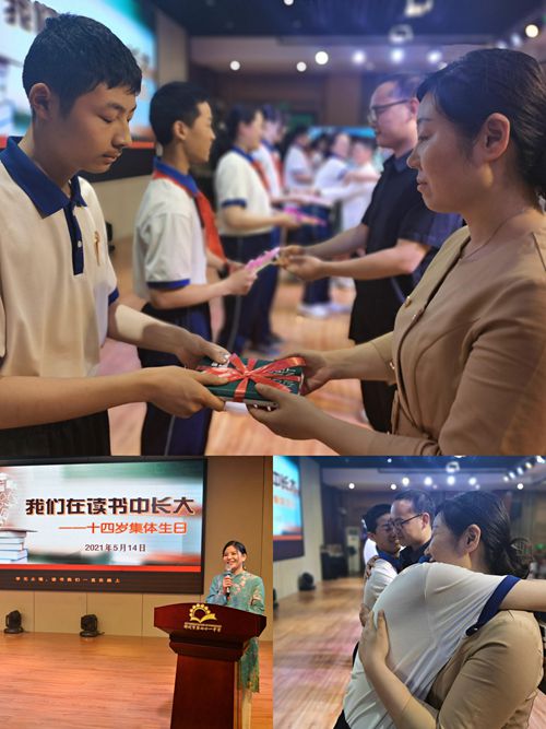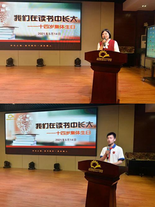 活動第二個版塊:感恩父母,感恩老師。鮮衣怒馬少年時,又是一年讀書日。由八年級學部帶來的配樂詩朗誦——《我們在讀書中長大》,講述了莘莘學子如何在讀書中成長,在云水間翱翔;親情,是波動著清水推動小船向前的雙槳,是守候在空中為小船指航的燈塔。八年級六班周林舒媽媽從讀書的意義以及在學生成長過程中書籍的重要性進行了精彩的發言,并推薦給所有學生一份書單作為十四歲的生日禮物,同時十名家長代表在十四歲集體生日之際,為學生代表贈送了最好的禮物——書籍;小小的粉筆,描繪出了教師心中的藍圖,八年級學部主任李琨老師代表全體教師發言,把希望和美好的祝愿帶給了所有的孩子。