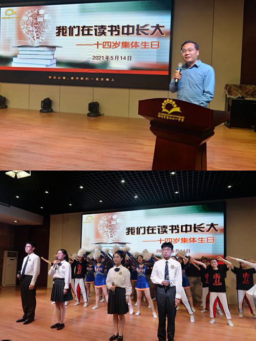 活動第三個版塊:莊嚴宣誓。學生代表劉孟陽的發言激動了在場的每一少年,在錚錚誓言下,他們堅定了青春的信念,必會朝著自己的目標努力奮進。徐建志校長的寄語《永遠對青春充滿熱情》從青春的顏色和意義談起,通過古今名人志士的讀書勵志故事告訴學生,讀書是青春年華最美好的時光,最后徐校長送上了他對學子的深深祝福,并祝大家十四歲生日快樂。