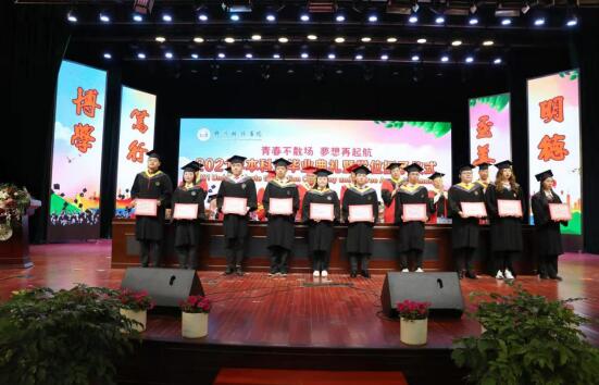 在畢業典禮上,副董事長、黨委副書記秦小剛宣讀《鄭州科技學院優秀大學畢業生表彰決定》,副校長李利民宣讀《鄭州科技學院關于表彰考取碩士研究生學生的決定》,校領導為獲獎學生頒發榮譽證書。