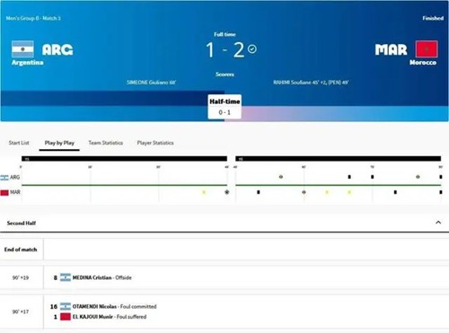 在比賽中斷許久后,直至北京時間25日凌晨,官方終于更新了信息:梅迪納最后階段的進球因越位被判無效,阿根廷隊1:2告負。此外,下半場補時達到了驚人的近20分鐘,這在足球比賽中極為罕見。