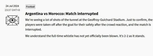 隨后相關公告稱,在阿根廷隊打入扳平進球后,鑒于現場球迷氛圍,出于球員安全考慮,比賽中斷,彼時場上比分顯示為2:2。