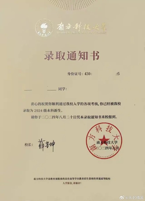 根據網友提供的南科大錄取通知書截圖,其在主頁中寫道:“衷心的祝賀你順利通過我校入學的各項考核,你已經被我校錄取為2024級本科新生。請你于二〇二四年八月二十日憑本錄取通知書來校報到?!?/p>