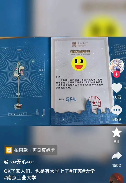 【孫卓被南京工業大學錄取】7月25日,電影《親愛的》的人物原型孫海洋的兒子孫卓通過個人社交賬號發布視頻稱,“OK了家人們,也是有大學上了?!币曨l曬出的錄取通知書顯示,孫卓被南京工業大學數理科學學院應用物理學專業錄取。