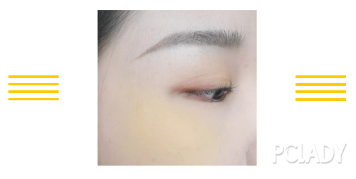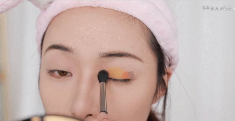 整個眼妝運用的三個啞光色,選擇檸檬黃大面積點涂在眼皮上作為主色,再將橙色放在眼皮的后半段,灰色壓在眼尾。用一把松散的暈染刷整體暈染開