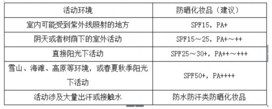 為了全面防護,要選擇既能防護UVB又能防護UVA的防曬化妝品,即產品標簽標識有SPF值和PA等級或廣譜防曬的產品。那么是不是直接購買SPF值最大,PA“+”最多的防曬化妝品就最好呢?其實不然。雖然SPF值越大、PA“+”越多的產品防曬效果越好,但同時也意味著添加的防曬劑含量越高或者成分越復雜,過度使用會加重皮膚的負擔,甚至還可能引起皮膚不良反應。因此應根據環境條件選用防曬化妝品,具體情況可參考下表。