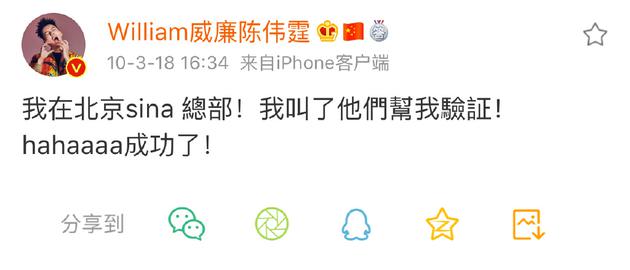 8月29日,有網友在微博上曝光陳偉霆曾經在2010年3月18日親自到新浪總部認證自己的微博,這一行為前無古人,后無來者,讓網友直呼可愛。