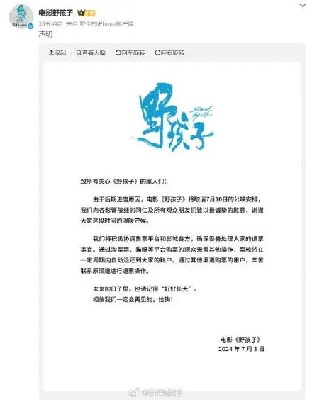 首個早上提檔晚上撤檔的電影!《野孩子》官宣:妥善處理退票事宜