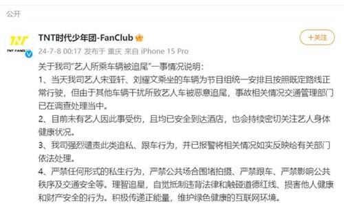 7月8日凌晨,時代少年團粉絲俱樂部官方微博再發《關于我司“藝人所乘車輛被追尾”一事情況說明》: