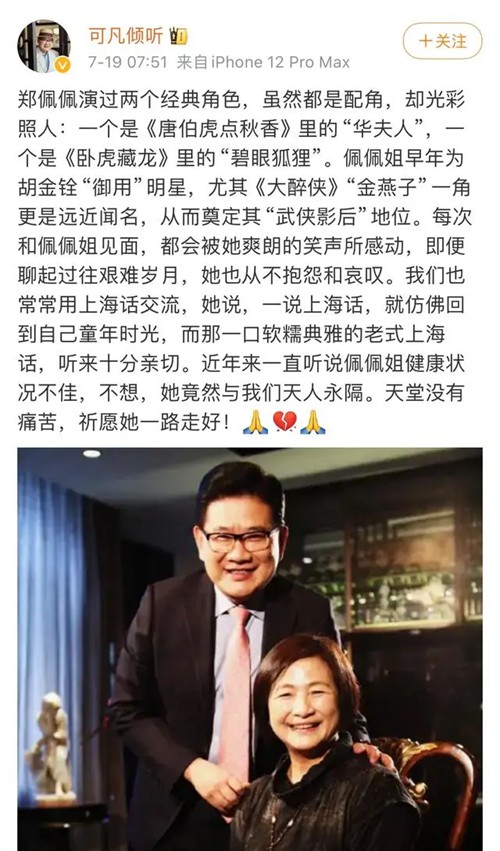 主持人曹可凡悼念鄭佩佩:祈愿她一路走好!