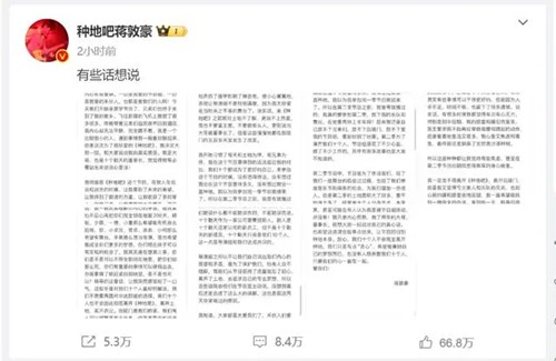 《種地吧》蔣敦豪發長文回應:十個勤天只會是我們10個人
