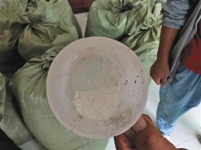 童樺從作坊內取出一些白色粉末?!斑@是焦亞硫酸鈉,只要溶在水里,就有一股臭味,”童樺將焦亞硫酸鈉灑在積水的地面,記者用手蘸水,湊到鼻子處,味道刺鼻。