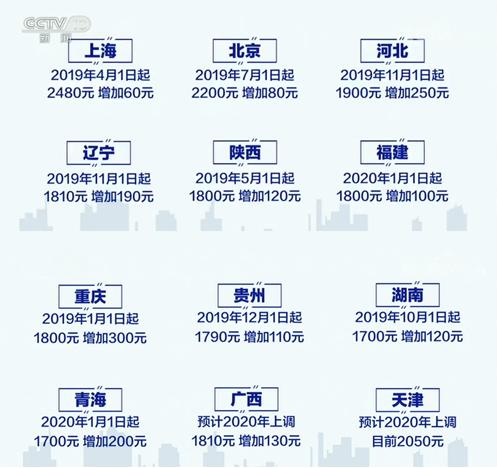 與此同時,廣西已就調整方案征求意見,2020年每月最低工資三檔標準均擬上調130元。截至2019年11月份,上海、北京、廣東、天津、江蘇、浙江6省份的月最低工資標準超過2000元。