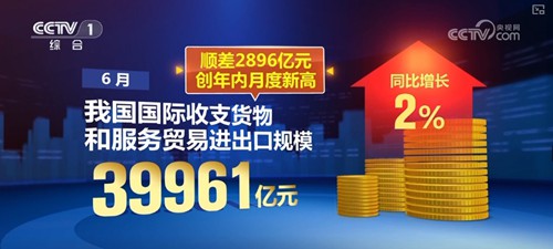 6月,我國國際收支貨物和服務貿易進出口規模39961億元,同比增長2%;順差2896億元,創年內月度新高。