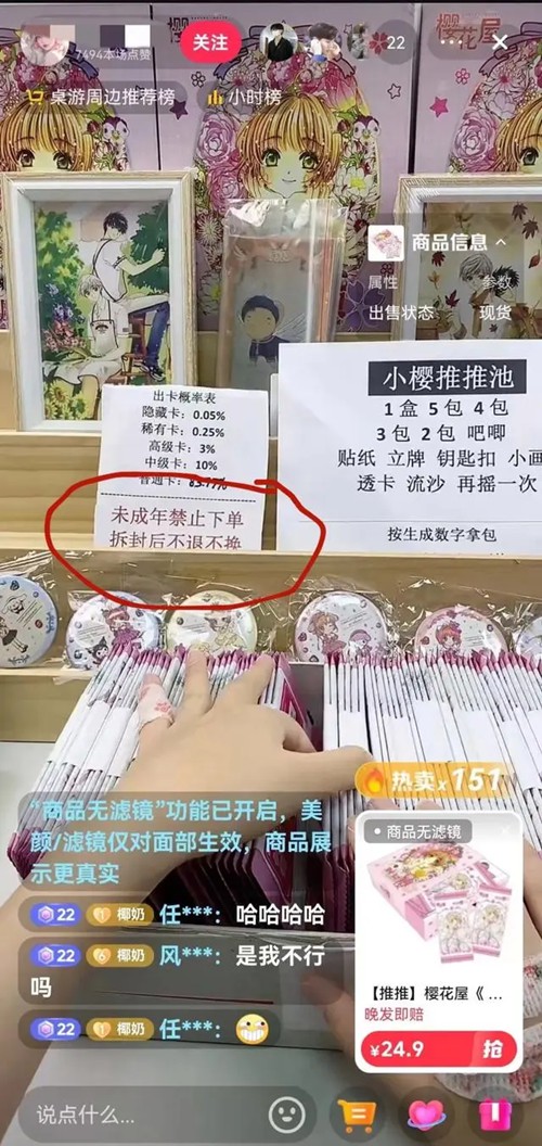 ▲某拆卡直播間放置“未成年人禁止購買,拆封不退不換”提示牌