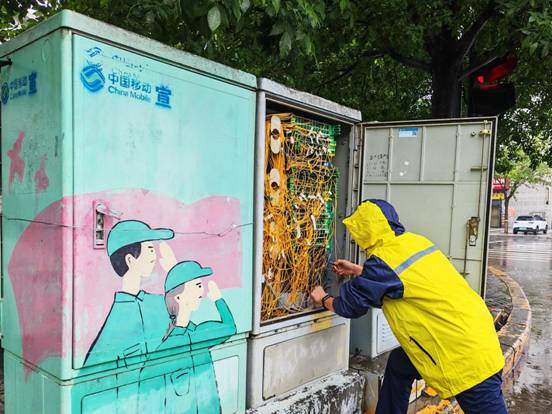 (圖為中國移動河南公司新鄉分公司保障人員冒雨搶修光交箱現場)