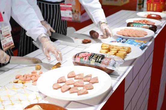雙匯展廳內的展品琳瑯滿目、品類豐富,我們可以看到企業對肉類美食的探索,早已從“一支火腿腸”拓展出更多可能。僅肉制品就涵蓋了簡頌午餐肉、金沙蛋黃腸、豬腱子肉火腿、富樂鹵味腸等特色產品系列,焦香蜜汁腸、塞納諾火腿、山核桃木煙熏原切培根、薩納齊瓊香腸等史蜜斯系列,玉米肉棗腸、脆骨肉條香腸、火爆小郡肝等匯小鋪零食系列,鹵福齋中式產品禮盒系列,招牌面、香菇雞丁米線、酸辣粉等方便速食系列。