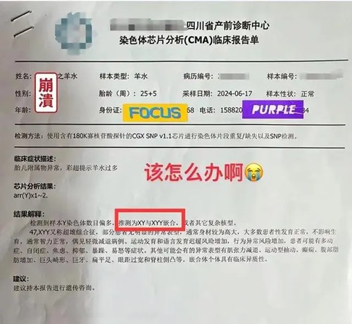 根據這位孕媽媽在網上發布的臨床報告單顯示,她懷孕已經25+5周,臨床癥狀描述:胎兒附屬物異常,彩超提示羊水過多。結果解釋:檢測到樣本Y染色體數目偏多,推測為XY與XYY嵌合,或者其它復雜核型。