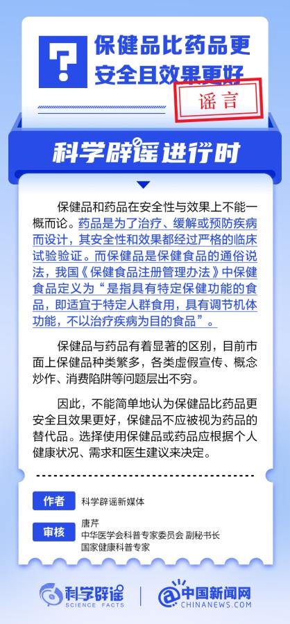 藥品是為了治療、緩解或預防疾病而設計,其安全性和效果都經過嚴格的臨床試驗驗證。而保健品是保健食品的通俗說法,我國《保健食品注冊管理辦法》中保健食品定義為“是指具有特定保健功能的食品,即適宜于特定人群食用,具有調節機體功能,不以治療疾病為目的食品”。不能簡單地認為保健品比藥品更安全且效果更好,而且保健品不應被視為藥品的替代品。
