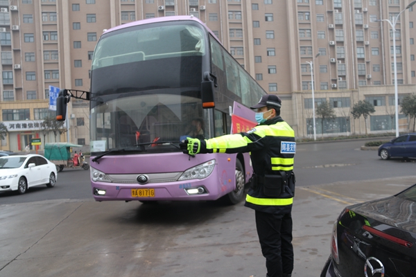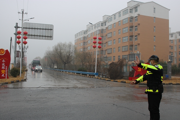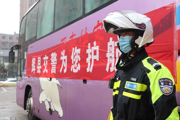 2月28日清晨春雨綿綿,交警大隊執勤人員一早將5輛復工人員乘坐的專車先后接送到輝縣市人力資源保障局和吳村鎮政府,等候鄭州富士康輝縣市工作人員上車。