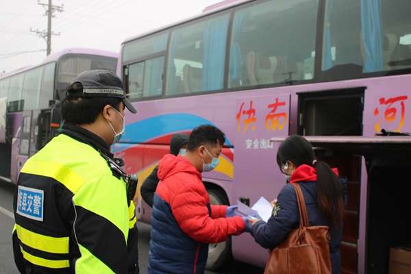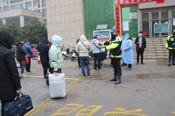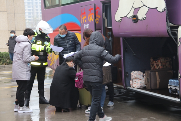 上車前,在疾控中心人員對返崗員工進行身體檢查的間隙,民警對各車駕駛員進行交通安全教育,囑咐全體駕駛員遵守交通法律法規。
