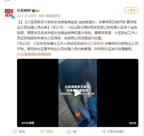 保安多次在個人號曬女性乘電梯監控 當地街道辦回應:涉事保安已被開除 要求物業公司加強人員約束